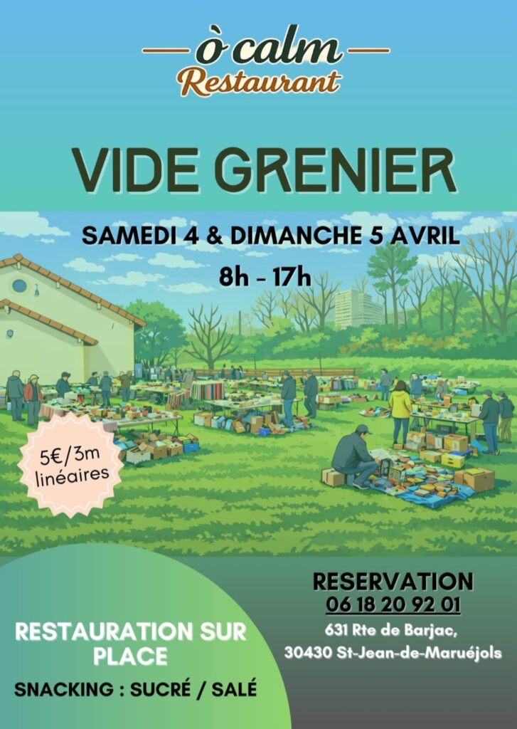 Le restaurant Ò Calm organise un grand vide‑grenier le samedi 4 et le dimanche 5 avril, de 8h à 17h, à Saint‑Jean‑de‑Maruéjols. Deux jours entiers pour chiner, vendre, se balader en famille et profiter d’une ambiance conviviale au cœur du village.